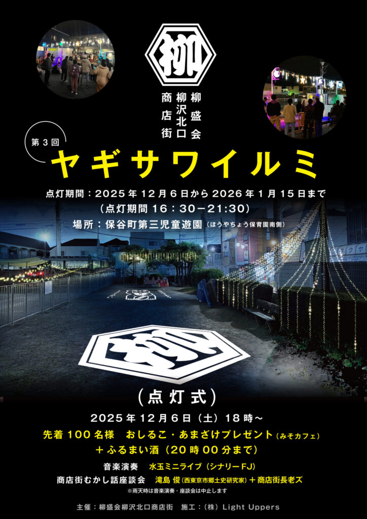 柳盛会柳沢北口商店街では、今年も冬の風物詩「ヤギサワイルミ」を開催いたします。